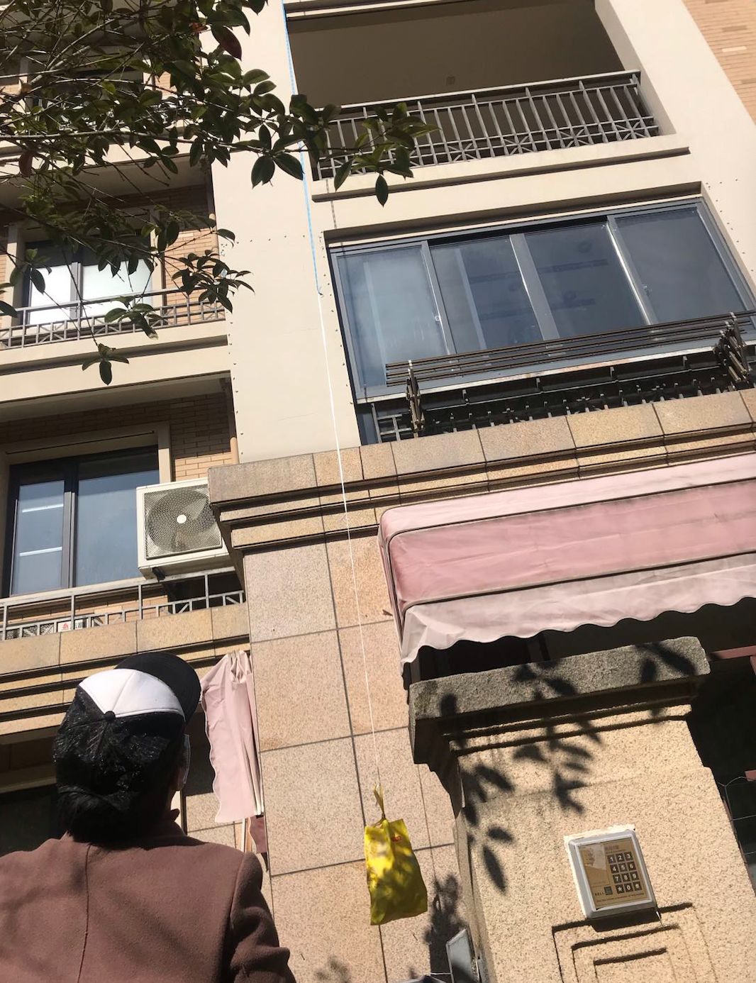 丽景湾小区内,一位顾客用绳子接收尹维送来的水果